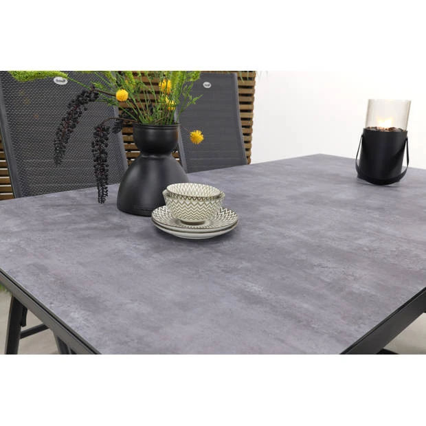 De Baltimor tuintafel biedt met zijn lengte van 180 cm. plaats aan 4 personen. Je kan eventueel met 6 personen dineren door gebruik te maken van de kopse kanten van de tafel. Het frame van de Baltimor tuintafel is vervaardigd uit aluminium en behandeld met een beschermende coating. Deze coating zorgt ervoor dat het frame kras- en stootvast is. Voordeel van aluminium is dat het weinig onderhoud nodig heeft, licht in gewicht is en niet kan verroesten. Het tafelblad van de Baltimor tuintafel is gemaakt van “ceramic on glass”. Dit is een keramiek laagje dat op een geharde glasplaat wordt aangebracht. Beide materialen zijn bestand tegen diverse weersinvloeden en perfect geschikt voor gebruik buitenshuis. Wanneer het tafelblad vies is geworden kun je deze het beste schoonmaken met water en een zachte doek. Voor een grote schoonmaakbeurt kun je een neutraal reinigingsmiddel toevoegen. Gebruik voor het schoonmaken nooit schuurmiddelen zoals een schuursponsje. Dit kan namelijk vegen en vlekken veroorzaken die er niet meer uit gaan. Gebruik nooit een hogedrukreiniger. Door de hoge waterdruk kan het materiaal aangetast worden.