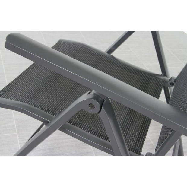 De verstelbare tuinstoel heeft een aluminium frame. De stoel heeft een textileen zit en rugleuning. De armleuning van de stoel is van aluminium. Door deze materialen gezamenlijk te gebruiken heeft u een stevige maar ook een zeer mooie stoel. De stoel is te verstellen in meerder standen zodat hij perfect zit tijdens het eten maar dat u ook lekker in het zonnetje kunt gaan zitten met de rugleuning in de relax modus.