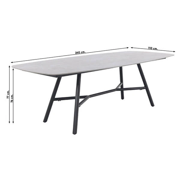 De Hartman Benevento tuintafel heeft een prachtig Deens ovale vorm met een antracietkleurig, 1 cm dik keramisch tafelblad en een stevig aluminium tafelonderstel. Het keramische blad is niet alleen zeer duurzaam en krasbestendig, maar ook onderhoudsvriendelijk en gemakkelijk schoon te maken. Aluminium is ook gemakkelijk te onderhouden en roest niet. Om de levensduur van je tafel te verlengen, raden we aan om de tafel regelmatig schoon te maken met een mild schoonmaakmiddel en water, en deze af te drogen met een zachte doek. Door de afmeting van 240×110 cm. kan je met gemak met 6 personen aanschuiven.