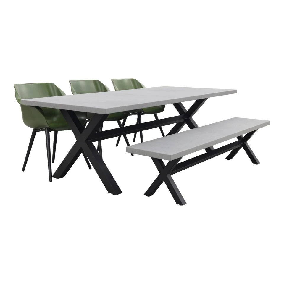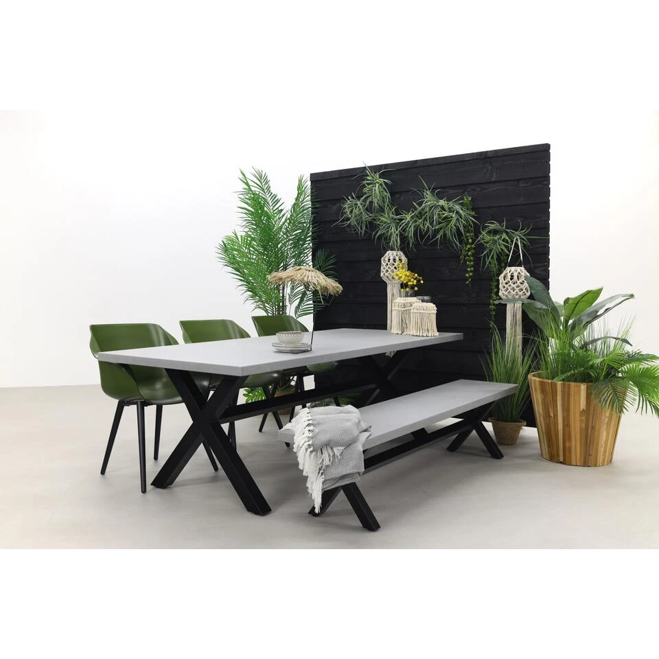 Wil jij graag een stoere en industriële tuinset om heerlijk aan te dineren? Dan is dit de juiste tuinset voor jou! De Verona tuintafel en tuinbank hebben al een prachtige look van zichzelf. Het zwarte frame in combinatie met het betonlook blad wat erop ligt. Daar hebben wij de Moss Green Sophie Studio tuinstoelen aan toegevoegd. Hiermee krijgt deze tuinset nog een stoerder tintje! De stoel- bank combinatie is helemaal van deze tijd. Zie jij jezelf al zitten aan deze blikvanger?