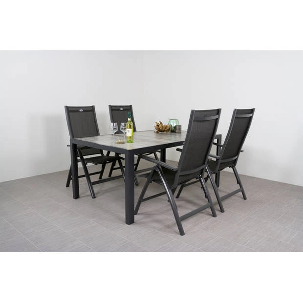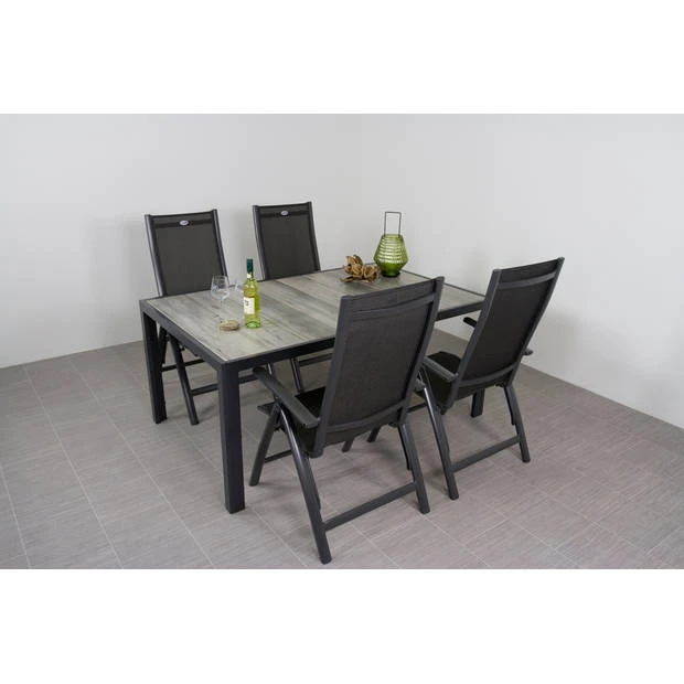 De Hartman Tanger tuintafel heeft een aluminium frame. Voor dit materiaal is bewust gekozen door de leverancier. Aluminium is namelijk erg stevig, licht van gewicht en het materiaal kan niet gaan roesten. Als tafelblad is een keramiek steen. Dit is een soort steen dat erg hard is en super onderhoudsvriendelijk is. Het tafelblad heeft een hout look maar dan zonder onderhoud. De Tanger tafel is 168 cm. lang en 105 cm. breed en dus perfect geschikt om met 4 personen aan te dineren. Ook is de tuinset nog uit te breiden met de stoelen op de kopse kanten van de tafel en kan je dus zelfs met 6 personen heerlijk buiten eten.