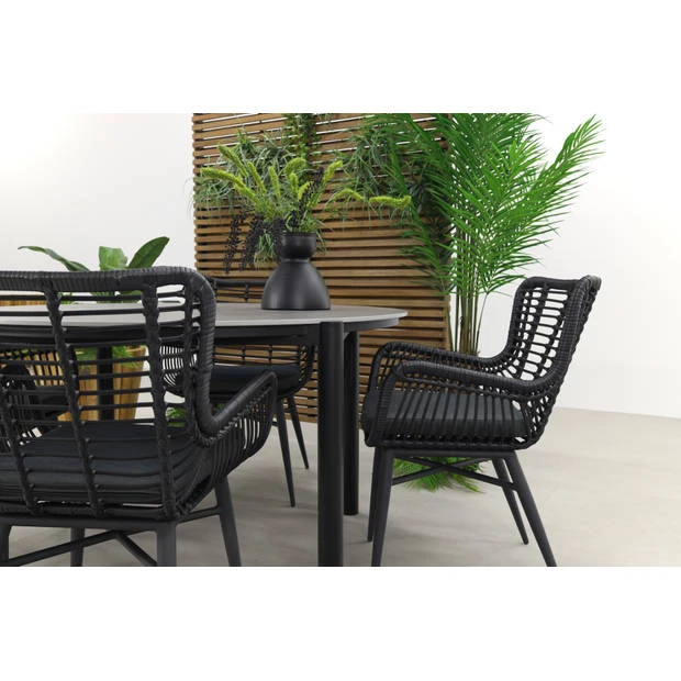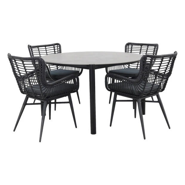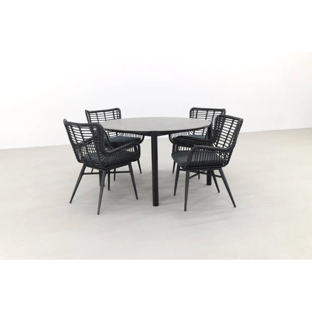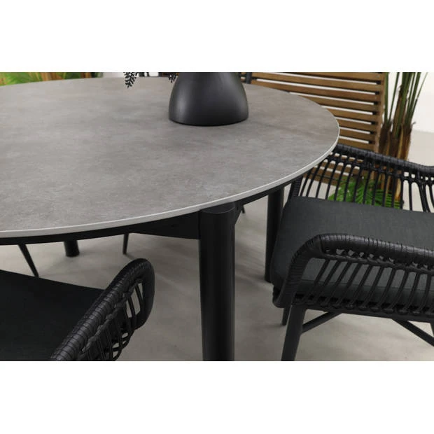 Moderne tuinset met een chique uitstraling. De Arezzo ronde tuintafel heeft een stijlvol frame van aluminium met een zwarte coating. Op dit onderstel rust het ceramic tafelblad. De ronde vormgeving van de Arezzo tuintafel geeft een unieke uitstraling aan je terras, helemaal in combinatie met de Jasmine tuinstoelen. Deze hippe tuinstoelen maken de set écht compleet. De Jasmine stoelen worden geleverd inclusief comfortabel zitkussen. Een lange avond borrelen of dineren is dan ook geen probleem.